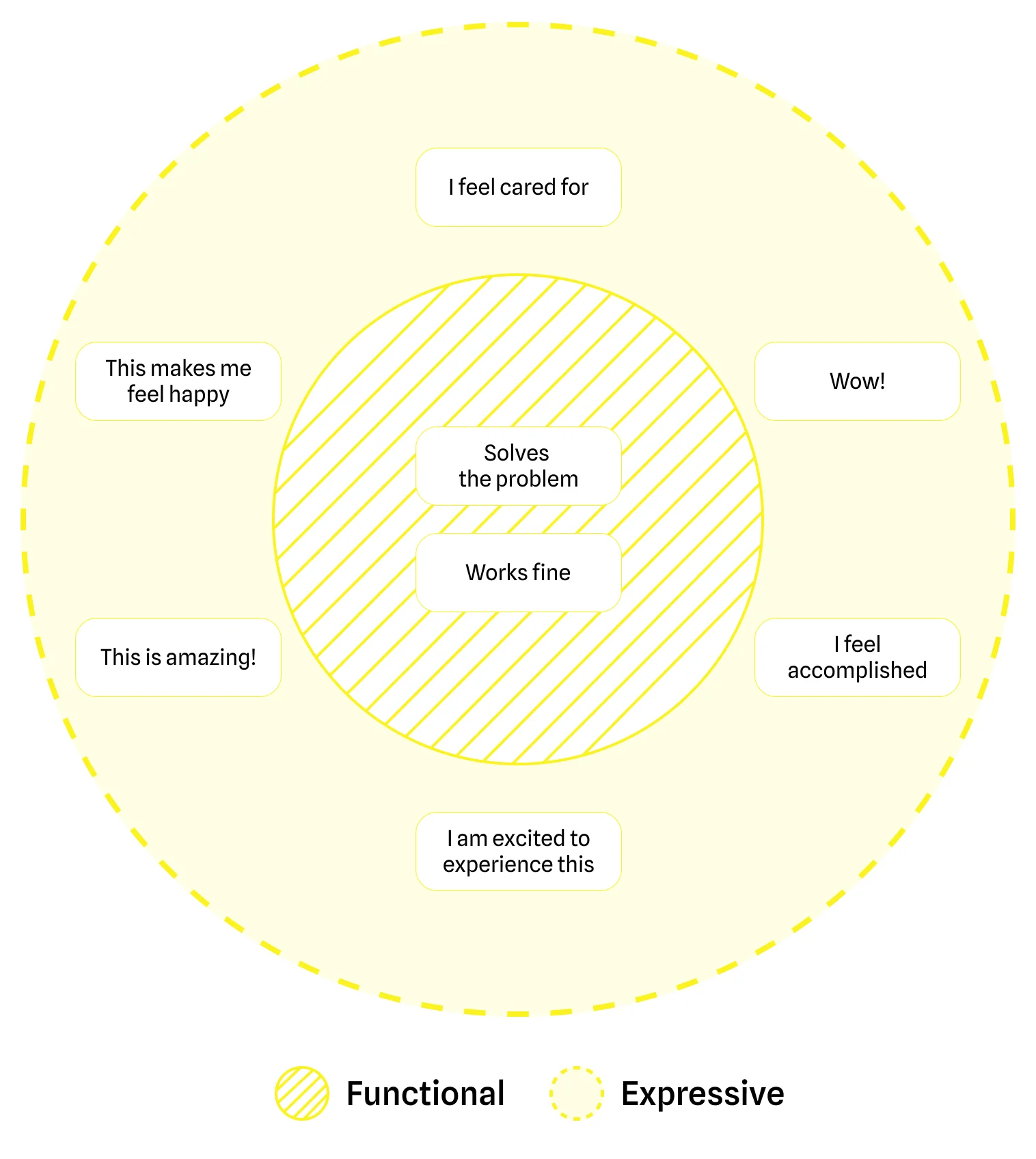Sul blog di Synechron, Functional vs. Expressive Design, Farish Hubiyan propone uno schema che mostra il design come due cerchi concentrici: al centro la funzione (“solving the problem”, “works well”), intorno l’espressione (“this is amazing!”, “makes me happy”)8.